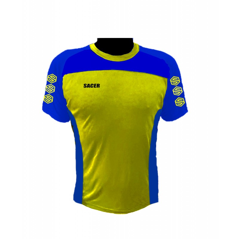 COLOR AMARILLA, CON MANGAS Y LATERAL EN COLOR AZUL ROYAL, LOGOS EN COLOR BLANCO