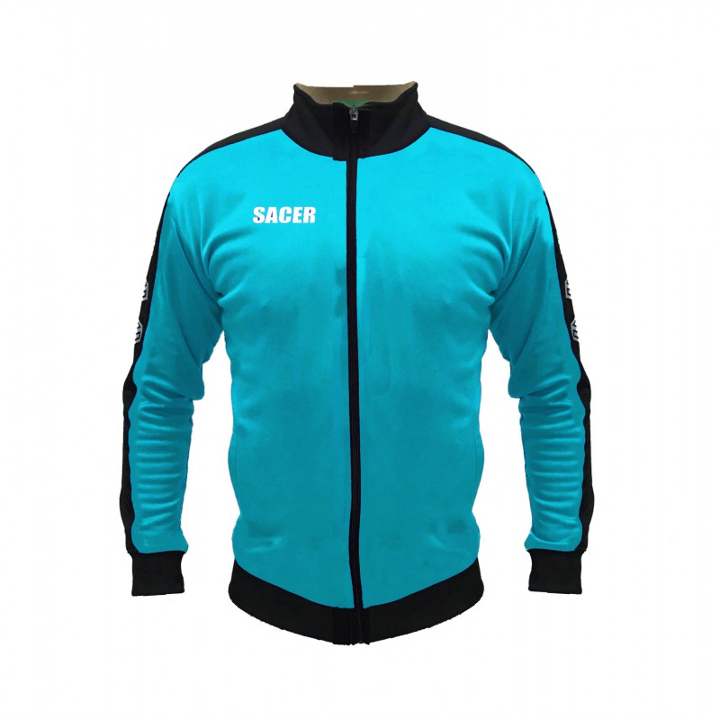 COLOR AZUL CELESTE FLEX, CON LINEA LATERAL EN LAS MANGAS EN NEGRO.